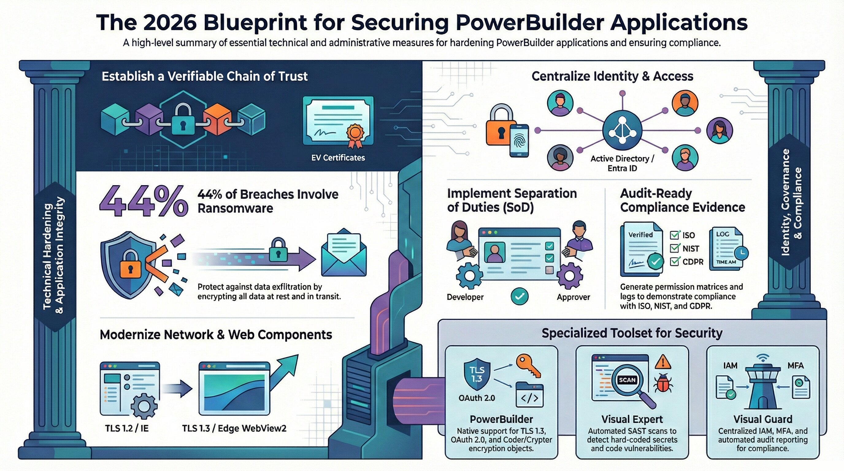A recently published PowerBuilder security guide proposes a structured roadmap that organizations can use to modernize security step by step. Rather than focusing only on code, the guide looks at the entire application lifecycle: development, deployment, data protection, access control, and audit readiness.